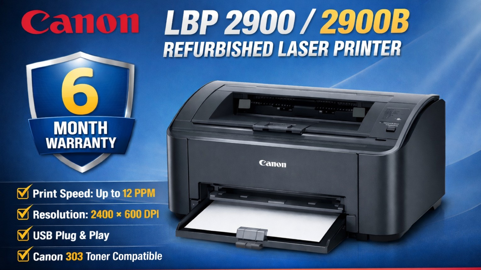 The Canon LBP 2900 / 2900B Refurbished Laser Printer is a highly reliable and cost-effective monochrome printing solution designed for home users, offices, retail shops, and billing counters. This renewed printer is professionally serviced, fully tested, and restored to deliver performance close to a new printer at a much lower price.