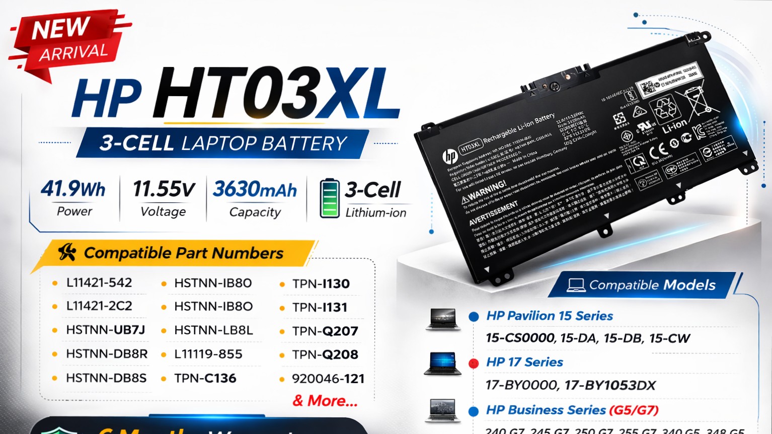 We are pleased to inform you that the HP HT03XL 3-Cell Laptop Battery (41.9Wh | 11.55V | 3630mAh) is now available in stock.