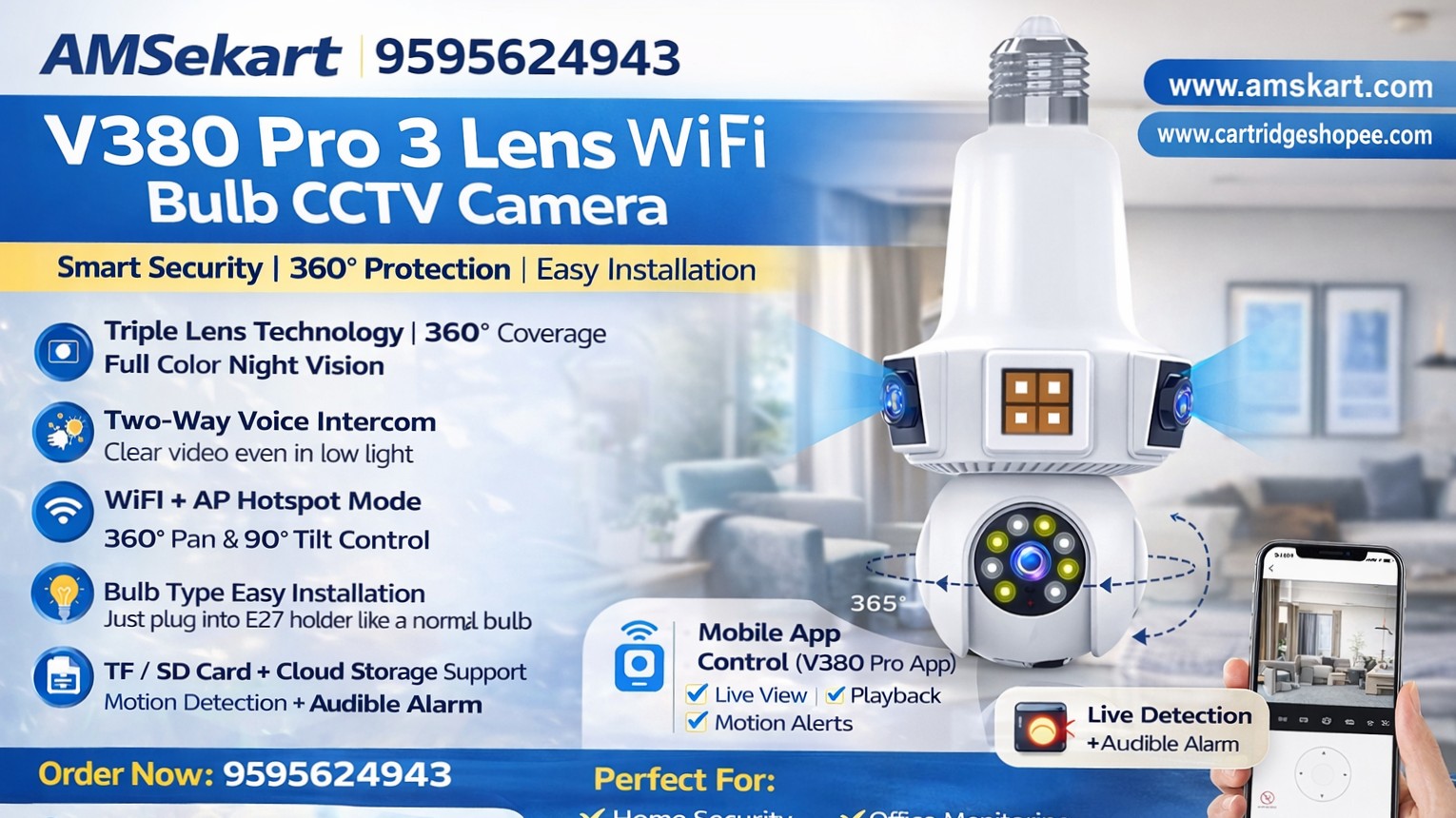 Now available with improved multi-angle monitoring and stable WiFi connectivity, the V380 Pro 3 Lens WiFi Bulb CCTV Camera is designed to deliver complete 360° security coverage for homes, shops, and offices. The advanced triple lens system helps monitor multiple areas simultaneously, reducing blind spots and improving surveillance efficiency.