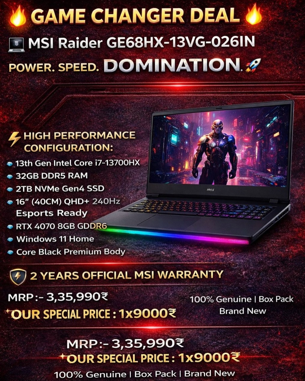 Experience next-level gaming and ultra-high performance with the powerful MSI Raider GE68HX-13VG-026IN gaming laptop. Built for gamers, creators, and power users, this premium machine combines cutting-edge hardware with aggressive gaming design to deliver unmatched speed, graphics, and multitasking performance.