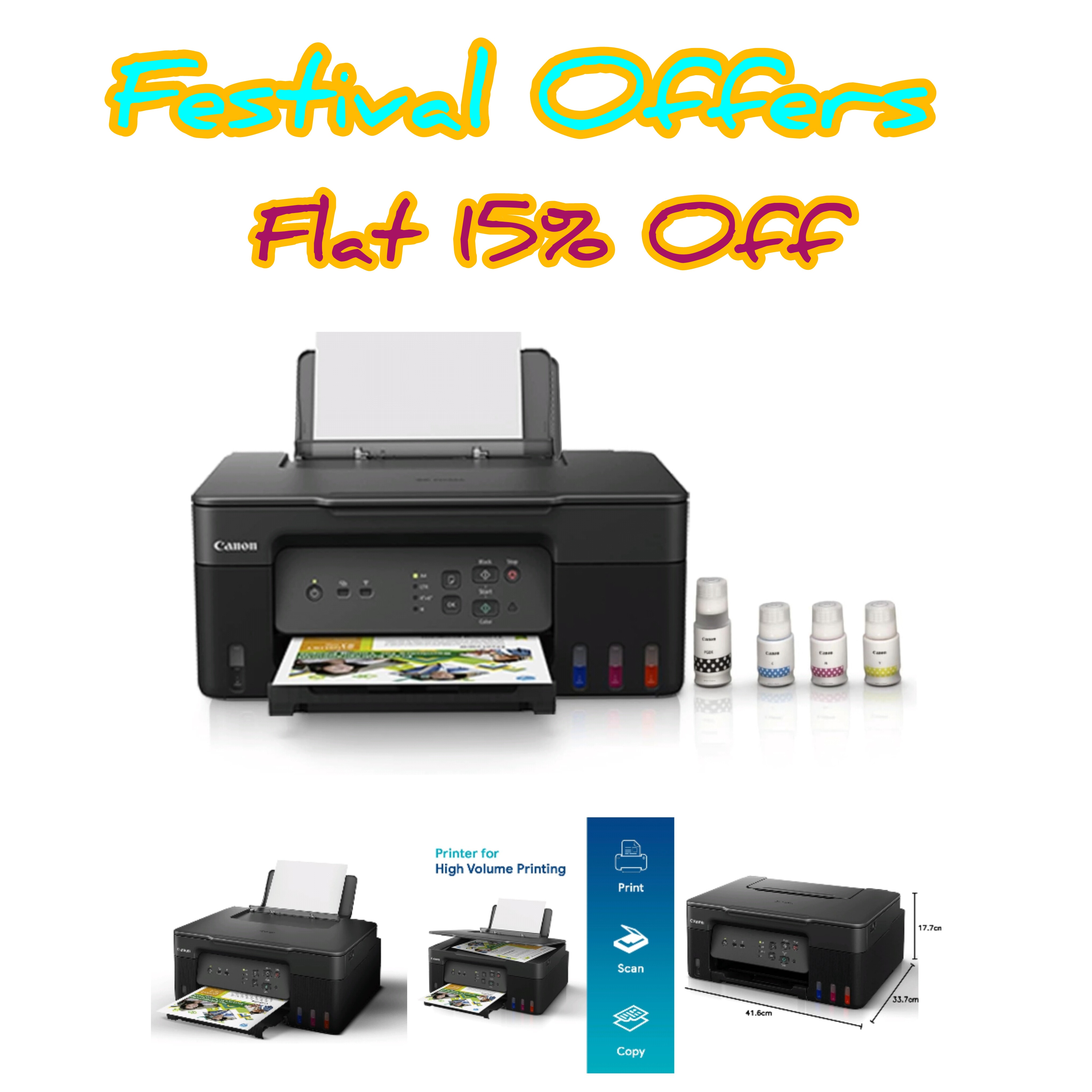 Printer type: Inkjet ; Functions: Print, Scan, Copy ; Printer output: Colour ; Connectivity: Wi-Fi, AirPrint, Mopria, Direct Wireless, USB 2.0 ; Scanner: Yes ; Scanner resolution:600 x 1200dpi OS Compatibility: Windows 11 / 10 / 8.1 / 7 SP1 (operation can only be guaranteed on a PC with a pre-installed Windows 7 or later), macOS 10.14.6 – 12 or later, Chrome OS; Mobile connectivity : Yes (via Canon Print Service, PIXMA Cloud Link, Canon PRINT Inkjet/SELPHY, Airprint); Hardware Interface: USB 2.0 ; Enlarge/reduce option: No ; Duplex: No Maximum Print Speed: 11/6 (mono/color) images per minute; Print cost Monochrome: Rs 0.13 ; Print cost color: Rs 0.25 ; Maximum Print Resolution: 4800 x 1200 dpi Page size: A4, A5, A6, B5, LTR, LGL, Executive, Oficio2, B-Oficio, M-Oficio, Legal (India), Foolscap, F4, 4 x 6", 5 x 7", 7 x 10", 8 x 10", Envelopes , Square, Card Size ,Custom Size- Width: 55 - 216 mm, Length: 89 - 1,200 mm; Max paper thickness: 64 to 275 GSM ; Maximum Input Sheet Capacity: 100 sheets (A4); Compatible ink:GI 71 Cyan, Magenta, Yellow, Black; Additional Printer Function:, Print modes- Standard and Economy ; Power wattage of printer: OFF: 0.1W, Standby (scanning lamp is off):0.6W, Copying (USB connection to PC): 16W Special Features: Borderless Print, Camera Direct via Wireless LAN; Ideal Usage: Home, Home Office; Included Components: Printer, Power Cord, USB cable, Instruction Manual, 1 set of GI71S Cyan, Magenta, Yellow and Black ink bottles Onsite Warranty - 1 year or 30000 prints (whichever is earlier) from the date of purchase.Use only genuine Canon ink. Using counterfeit ink will harm your printer as well as render the warranty void Page Yield: GI71S BK- 3100 prints, GI71S Cyan, Magenta, Yellow- 4400 prints as per ISO/IEC 24711 (for A4 size) using ISO/IEC 24712 test file.