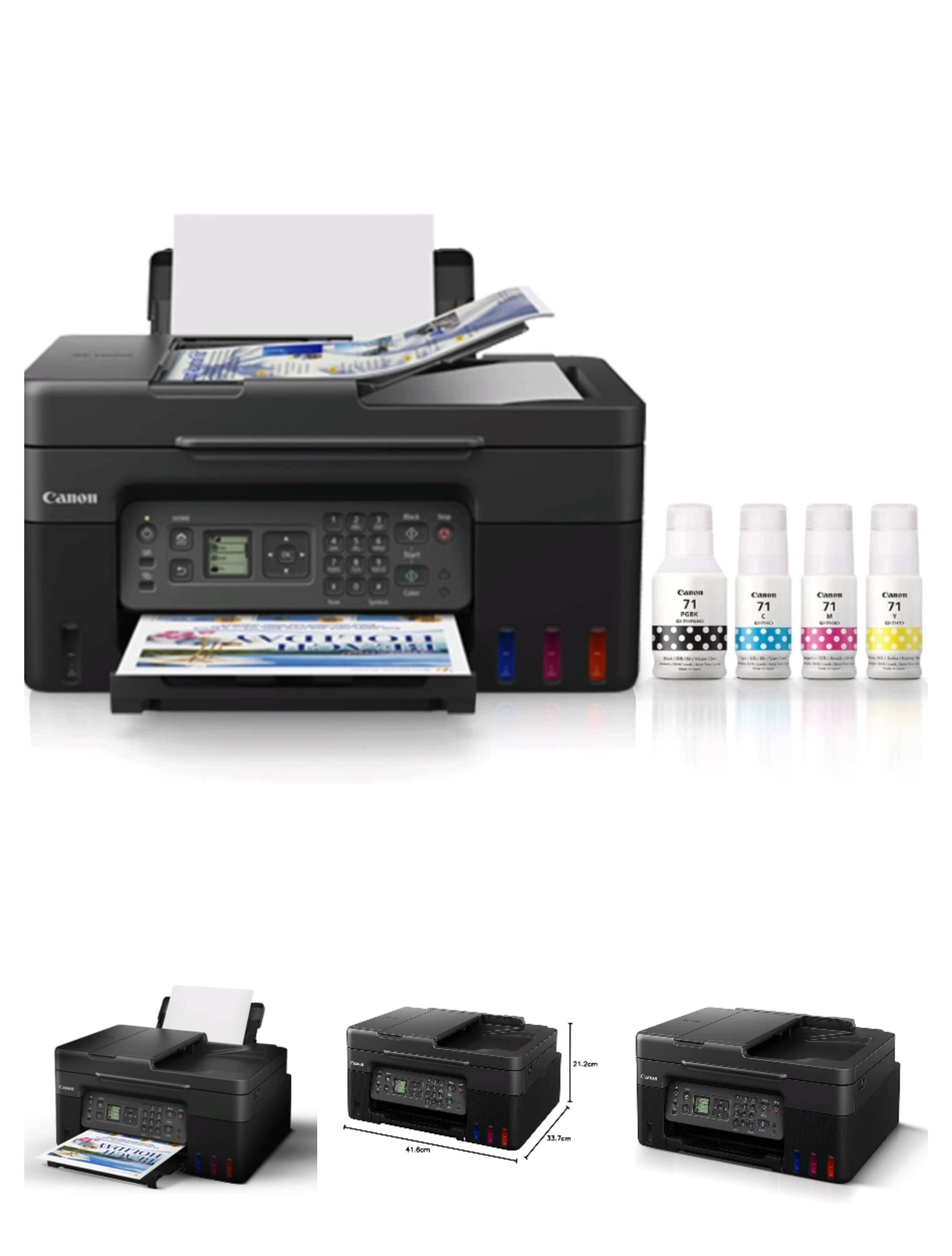 Canon PIXMA MegaTank G4770 All-in-one (Print, Scan, Copy) Wireless Inktank Printer with ADF and Fax Printer type: Inkjet ; Functions: Print, Scan, Copy,FAX ; Printer output: Colour ; Connectivity: Wi-Fi, AirPrint, Mopria, Direct Wireless, USB 2.0 ; Scanner: Yes ; Scanner resolution:600 x 1200dpi OS Compatibility: Windows 11 / 10 / 8.1 / 7 SP1(operation can only be guaranteed on a PC with a pre-installed Windows 7 or later), macOS 10.14.6 – 12 or later, Chrome OS; Mobile connectivity : Yes (via Canon Print Service, PIXMA Cloud Link, Canon PRINT Inkjet/SELPHY, Airprint); Hardware Interface: USB 2.0 ; Enlarge/reduce option: No ; Duplex: No Maximum Print Speed: 11/6 (mono/color) images per minute; Print cost Monochrome: Rs 0.13 ; Print cost color: Rs 0.25 ; Maximum Print Resolution: 4800 x 1200 dpi Page size: A4, A5, A6, B5, LTR, LGL, Executive, Oficio2,B-Oficio, M-Oficio, Legal (India), Foolscap, F4,4 x 6", 5 x 7", 7 x 10", 8 x 10", Envelopes , Square, Card Size ,Custom Size- Width: 55 - 216 mm, Length: 89 - 1,200 mm; Max paper thickness: 64 to 275 GSM ; Maximum Input Sheet Capacity: 100 sheets (A4); Compatible ink:GI 71 Cyan, Magenta, Yellow, Black; Additional Printer Function: ADF, Print modes- Standard and Economy ; Power wattage of printer: OFF: 0.1W, Standby (scanning lamp is off):0.6W, Copying (USB connection to PC): 15W Special Features: 35 sheet ADF input, Borderless Print,1.3 inch display (Monochrome)with backlight, Camera Direct via Wireless LAN; Ideal Usage: Home, Home Office; Included Components: Printer, Power Cord, USB cable, Instruction Manual, 1 set of small size GI71 Cyan, Magenta, Yellow and Black ink bottles Page Yield: GI71 BK- 6000 prints, GI71 Cyan, Magenta, Yellow- 7700 prints as per ISO/IEC 24711 (for A4 size) using ISO/IEC 24712 test file. Onsite Warranty - 1 year or 30000 prints (whichever is earlier) from the date of purchase.Use only genuine Canon ink. Using counterfeit ink will harm your printer as well as render the warranty void