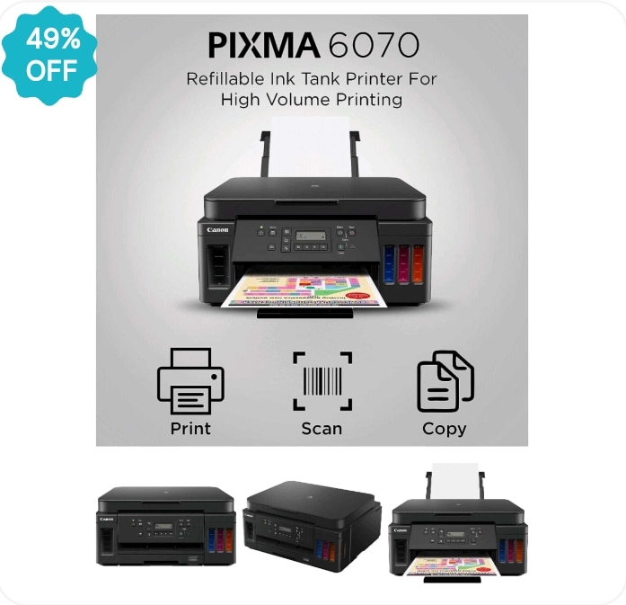 Canon PIXMA MegaTank G6070 All-in-one Wi-Fi Colour Ink Tank Printer with Auto-Duplex Printing and Networking (Black) Printer Type - Ink Tank; Functionality - All-in-One (Print, Scan, Copy); Printer Output - Color. Supports Smart Speakers- Print content through voice activation;Connectivity: WiFi, Wifi Direct, USB, Network, Airprint, Windows Mobile 10, Morpia, Google Cloud Print, Canon Print Service, Pixma Cloud Link, Canon Selphy App ; Compatibility:Windows 10/8.1/7 SP1, Mac OS X 10.10.5 ~ OS X 10.11, Mac OS v10.12 ~ 10.14 2 line LCD diplay on printer(mono) Pages per minute - 13.0 ipm (Black), 6.8 ipm (Colour), Cost per page - 10 paise (Black- Default), 8 paise (Black- Economy) 31 paise (Color) - As per ISO standards; Automatic system notification for ink levels. Ideal usage - Home and Small office, Regular / Heavy usage (more than 150 to 1500 pages per month); Country of Origin: Vietnam Control Method: Application Features: High Page Yield Ink Bottles: With high page yield ink bottles 8,300 pages (B/W) and 7,700 pages (colour), users can enjoy printing and never have to think or worry about ink costs. Spill-Resistant Ink Bottle Design: Ink bottles are truly spill-resistant, with a unique tip-and-receptacle design. Ink filling stops automatically when the air hatch of the tank touches the fluid level. Auto Duplex Printing: Enjoy productivity and great convenience by producing 2-sided prints automatically. 2-Way Paper Feeding: Accepts paper loading in 2 directions (front cassette and rear tray) so the printer is always ready to print on 2 different media types or sizes at any time. Mobile and Cloud Printing: Print from smartphones, mobile tablets and laptops with free-for-download apps like the Canon Print Inkjet/SELPHY, and Canon Easy-Photo Print Editor. Borderless Photo Printing: The printer supports borderless photo printing, so you can view and share photos without unsightly borders.