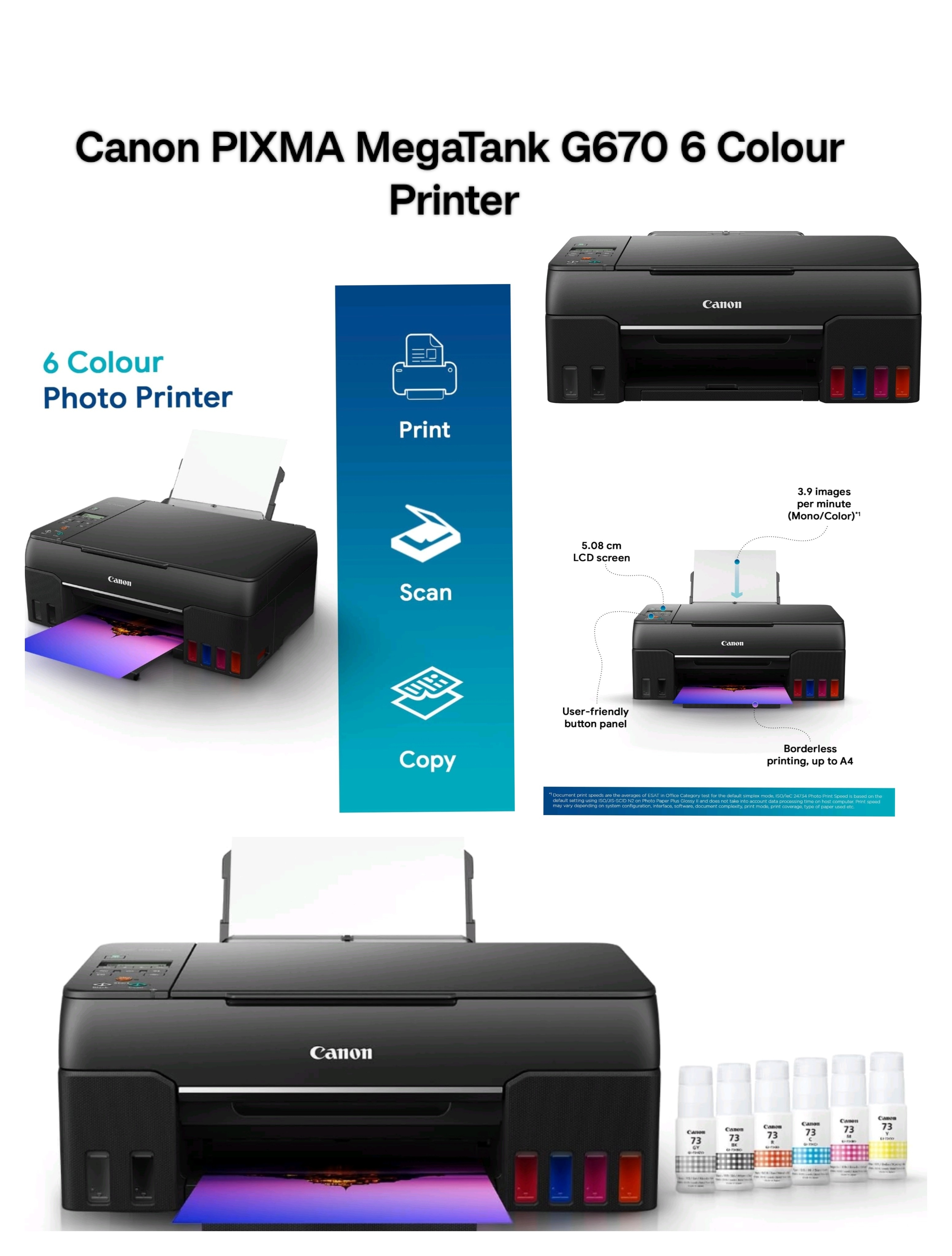Brand: Canon Connectivity Technology: Wi-Fi, USB Printing Technology: Inkjet Special Feature: Auto Power On,Refillable Ink Tank,Voice-Activation Colour: Black Model Name: PIXMA G670 Printer type: Inktank ; Functions: Print, Scan, Copy ; Printer output: Colour ; Connectivity: Wifi, USB ; Scanner: Yes ; Scanner resolution: 600 x1200 dpi OS Compatibility: Windows 10 / 8.1 / 7 SP1 (operation can only be guaranteed on a PC with a pre-installed Windows 7 or later) macOS 10.12.6 ~ 11, Chrome OS; Mobile Connectivity : Yes (via Canon Print Service, PIXMA Cloud Link,Easy Photo-Print Editor,Canon PRINT Inkjet/SELPHY) ; Hardware Interface: USB 2.0, Enlarge/reduce option: No ; Duplex:No Maximum Print Speed (color): 3.9 ipm , Maximum Print Speed (Monochrome): 3.9 ipm: Print cost Monochrome (A4): Rs 0.25, Print cost color(A4): Rs 0.54 , Print cost color(4x6 inch): Rs 1.48; Maximum Print Resolution(Color): 4800x1200 dpi, Maximum Print Resolution(Monochrome): 4800x1200 dpi Page size : A4, A5, B5, A6, LTR, LGL, Executive, Legal (India), Foolscap, B-Oficio, M-Oficio, 10.16x15.24cm (4 x 6in), 12.7x17.28cm (5 x 7in), 17.78x25.4cm (7 x 10in), 20.32x25.4cm (8 x 10in), Envelopes (DL, COM10, C5, Monarch), Square (8.89x8.89cm (3.5 x 3.5in), 12.7x12.7cm (5 x 5in)), Card Size (91 x 55mm); Max paper thickness (in GSM): 64 to 275 GSM ; Maximum Input Sheet Capacity: 100 sheets (A4) ; Compatible ink:GI- 73 Cyan, Magenta, Yellow, Red, Grey, Black; Additional Printer Function: Photo print quality; Power wattage of printer: OFF: Approx 0.2 W, Standby (scanning lamp is off) USB connection to PC: Approx. 0.6W, Copying USB connection to PC: Approx. 16W Special Features: High quality photo printer; Ideal Usage : Home, Photo lab and Photo Studio ; Included Components: Printer, Power Cord, USB cable, Instruction Manual, 1 set of GI 73 Cyan, Magenta, Yellow, Red, Grey and Black ink bottles Warranty - 1 year warranty from the date of purchase.Use only genuine Canon ink. Using counterfeit ink will harm your printer as well as render your warranty void