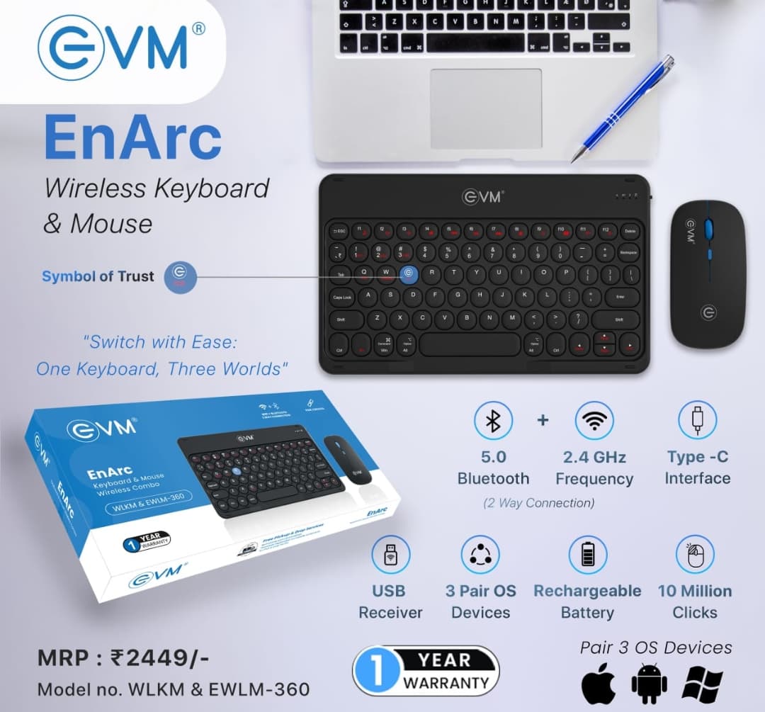 Upgrade your workspace with the EVM EnArc Wireless Keyboard and Mouse Combo (WLKM&EWLM-360) – a perfect blend of style, performance, and convenience. Designed for professionals, students, and home users, this combo brings a clutter-free, modern wireless experience to your desk. Featuring dual connectivity modes, you can easily switch between Bluetooth 5.0 and 2.4GHz wireless (USB receiver) for a stable, lag-free connection. Whether you’re working on a laptop, PC, tablet, or Smart TV, the EnArc combo is universally compatible across Windows, macOS, Android, and more. The slim and portable keyboard comes with well-spaced, responsive keys that provide a smooth and comfortable typing experience. The wireless mouse is designed with silent click technology, making it ideal for quiet environments like offices, libraries, or late-night work sessions. Say goodbye to the hassle of constantly changing batteries. This combo is equipped with a built-in rechargeable battery that offers extended usage and can be easily recharged via a Type-C cable, ensuring you stay powered throughout the day. With its elegant black finish, compact design, and lightweight build, the EVM EnArc Wireless Keyboard and Mouse Combo is not only practical but also stylish, making it perfect for travel and on-the-go professionals. Whether you’re working, studying, gaming, or browsing, this combo delivers reliable performance, smooth connectivity, and modern convenience – all in one package. Technical Specifications Brand: EVM Model: EnArc WLKM&EWLM-360 Product Type: Wireless Keyboard & Mouse Combo Connectivity: Bluetooth 5.0 + 2.4GHz USB Receiver Battery: Built-in rechargeable Charging Port: Type-C Design: Slim & Portable Mouse: Silent Click, ergonomic Compatibility: Windows / macOS / Android / Smart TV / Laptop / Desktop / Tablet Color: Black Key Features (Bullet Points) 1. ✅ Dual Wireless Connectivity – Switch seamlessly between Bluetooth 5.0 & 2.4GHz wireless USB receiver for lag-free typing and navigation. 2. 🔋 Rechargeable Battery – Built-in long-lasting rechargeable battery with Type-C charging, eliminating the need for frequent battery replacements. 3. 🎧 Silent Click Mouse – Low-noise design ensures distraction-free working in office, home, or study environment. 4. 💻 Universal Compatibility – Works with Windows, macOS, Android, Smart TVs, laptops, desktops, and tablets. 5. 👜 Slim & Portable Combo – Ultra-thin keyboard and lightweight mouse, perfect for travel, office, and on-the-go use.