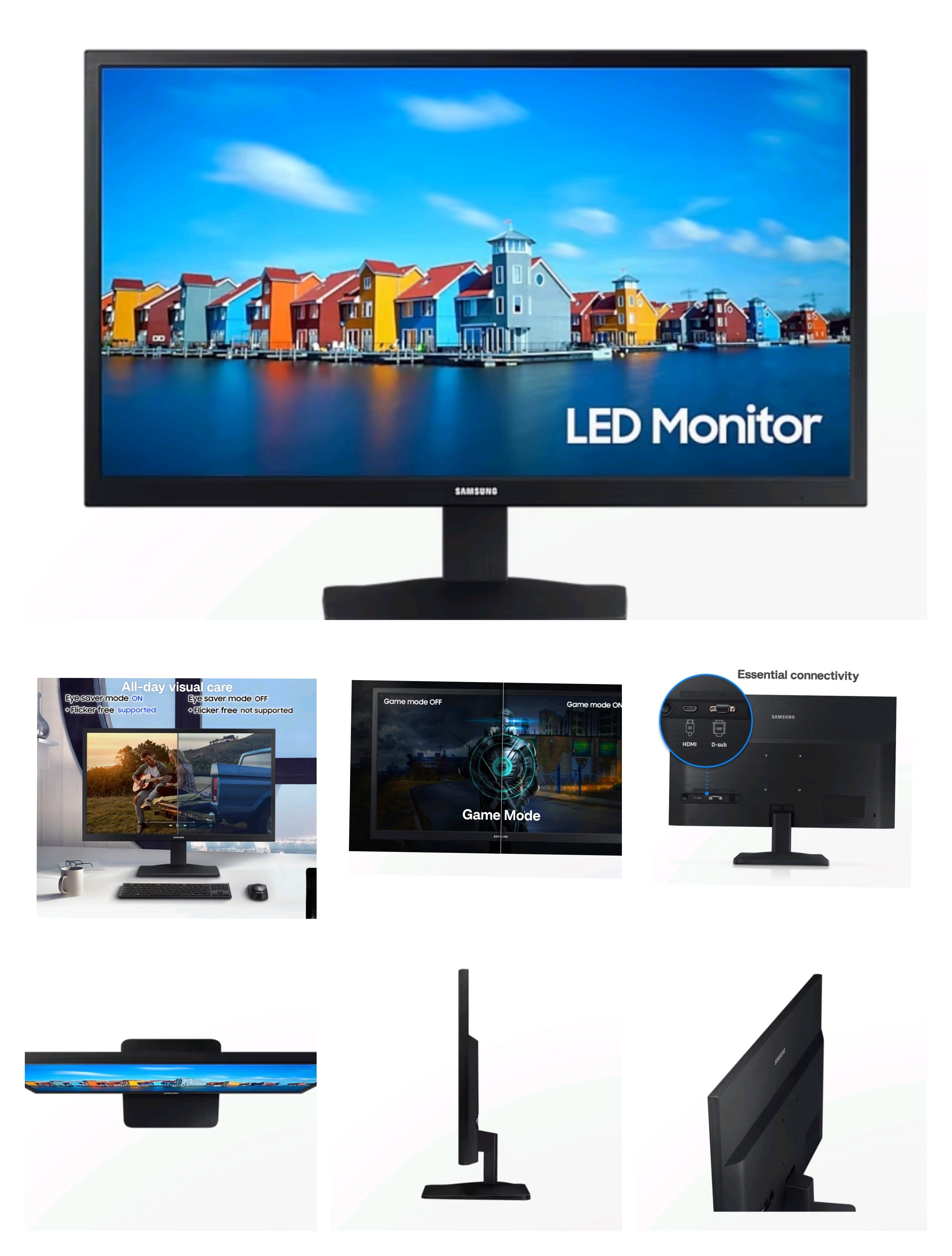 All-day visual care Virtually eliminate eye strain for more comfortable extended computing with eye comfort technology. Flicker Free continuously removes irritating flicker, while Eye Saver Mode minimizes blue light. Protect your eyes, keep them fresh, and do more. Essential connectivity Link your monitor to external memory drives and other devices with HDMI and D-sub ports. Now, your computing environment is even more convenient with additional input possibilities. Game Mode Game Mode instantly optimizes screen contrast to give you a competitive edge during gameplay. By selectively boosting contrast in scenes, Game Mode reveals more detail in dark areas to let you spot your enemies faster. Display Screen Size (Class)19 Flat / CurvedFlat Active Display Size (HxV)409.8 mm x 230.4 mm Aspect Ratio16:9 Panel TypeTN Brightness (Typical)250 cd/㎡ Brightness (Min)200 cd/㎡ Contrast Ratio Static600:1 (Typical) Contrast Ratio (Dynamic)Mega Resolution1,366 x 768 Response Time5 (GTG) Viewing Angle (Horizontal/Vertical)90°/65° Colour SupportMax 16.7M Colour Gamut (NTSC 1976)72% Refresh RateMax 60 Hz General Feature Eye Saver Mode Yes Flicker Free Yes Windows Certification Windows 10 Interface Wireless Display No D-Sub 1 EA DVI No Dual Link DVI No Display Port No Display Port Version No Display Port Out No Display Port Out Version No Mini-Display Port No HDMI 1 EA HDMI Version 1.4 Audio In No Headphone No USB Ports No USB Hub Version No USB-C No USB-C Charging Power No Audio Speaker No Operation Conditions Temperature 10~40 ℃ Humidity 10~80, Non-Condensing Design Color BLACK Stand Type SIMPLE Tilt -5.0° (±2.0°) ~21.0° (±2.0°) Wall Mount 75 x 75 Power Power Supply AC 100~240 V Power Consumption (Max) 12 W Power Consumption (Typ) 10.0 W Power Consumption (DPMS) Less than 0.3 W Power Consumption (Off Mode) Less than 0.3 W Power Consumption (Yearly) 15 kWh/year Type External Adaptor Dimension Set Dimension with Stand (WxHxD) 440.7 x 340.6 x 179.9 mm Set Dimension without Stand (WxHxD) 440.7 x 269.2 x 30.0 mm Package Dimension (WxHxD) 495.0 x 110.0 x 325.0 mm Weight Set Weight with Stand 2.1 kg Set Weight without Stand 1.8 kg Package Weight 3.0 kg Accessory Power Cable Length 1.5 m HDMI Cable Yes Mini-Display Gender No Install CD Yes