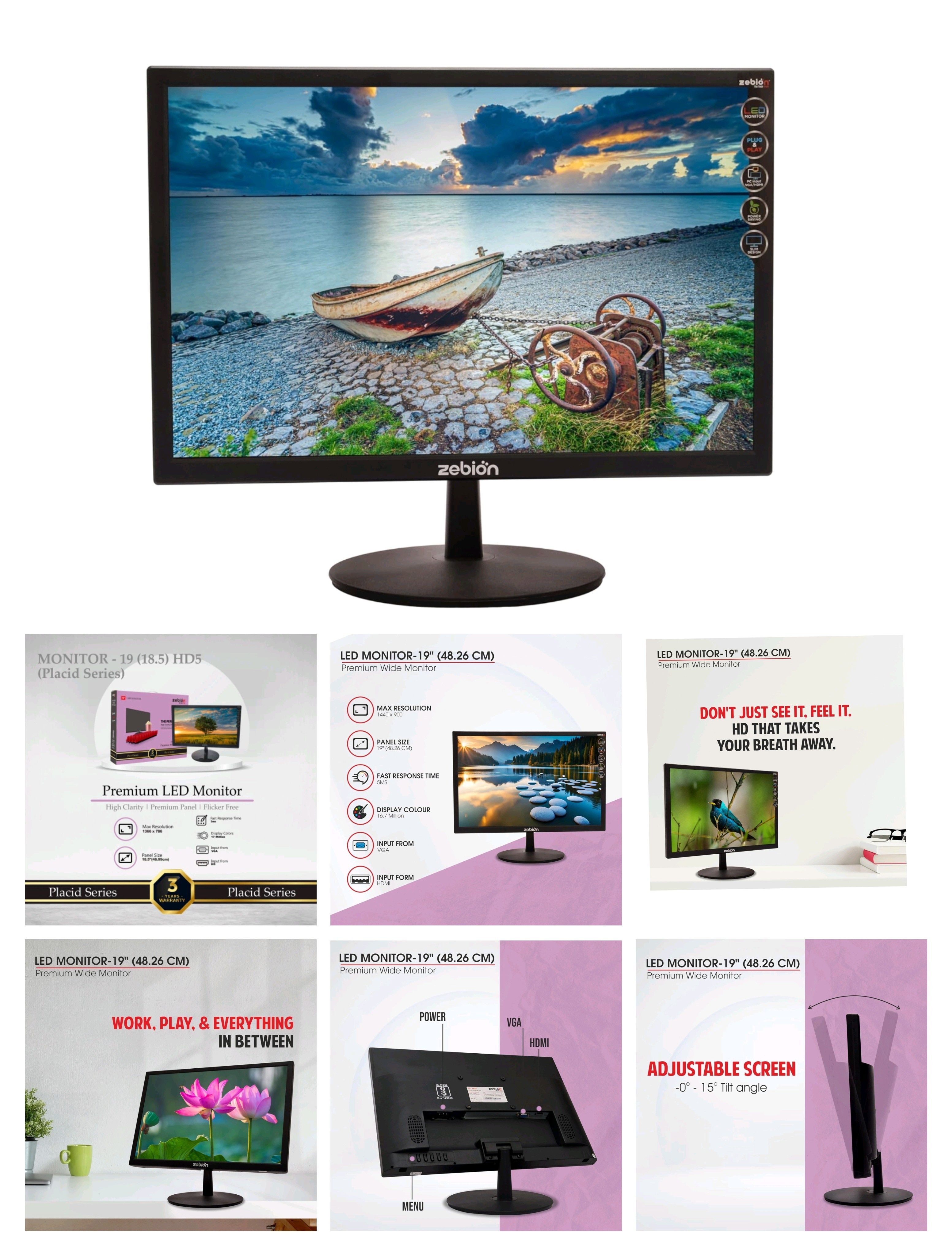 Product Details: Top Highlights Brand: Zebion Screen Size: 19 Inches Resolution: 2K DCI 1080p Aspect Ratio: 16:9 Screen Surface Description:Glossy Response Time: 5 Milliseconds 48.26cm Screen Size (19inch LED Display).Max. brightness 220cd/m² 48.26cm Screen Size (19inch LED Display) HDMI & VGA Ports for Input, Response Time: 8 ms HD 1440 x 900 Native resolution with 16:9 Aspect Ratio Supports 17 Million Colors 5ms Response Time & 0.3 x 0.3 mm Pixel Product Specification: Refresh Rate - 75 Hz Power Consumption - 18 Watts Display Resolution - Maximum 1440 x 900 Pixels Special Feature - Flicker-Free Connectivity Technology - VGA, HDMI Product Dimensions -15D x 30W x 30H Centimeters Specific Uses For Product - Desktop, Business Colour - Black Total HDMI Ports - 1 Display Technology - LCD Model Name - 18.5 HD5 LED Monitor Viewing Angle - 130 Degrees Image Brightness - 250 Candela Mounting Type - Wall Mount Voltage - 240 Volts (AC) Item Weight - 3 Kilograms Hardware Interface - VGA, HDMI Compatible Devices - Laptop, Desktop, Camera Display resolution - 1440 x 900 Warranty Type - 3Year Manufacturer Warranty Shape - Flat Manufacturer - Zebion Infotech Pvt.Ltd., Zebion Infotech Pvt. Ltd. , Zebion House, Plot No. 280 B/7, New Timber Merchant's Society, Near Sonmarg Theatre, Ghorpade Peth, Pune - 411 042. (Maharashtra) Model - 19HD5 Product Dimensions - 15 x 43.5 x 37.5 cm; 3 kg Item model number - 19HD5 Special Features - Flicker-Free Mounting Hardware - 1 Unit Monitor ,1 Unit Base, 1 Unit VGA Cable, 1 Unit Power Cord and user Manual Number of items - 5 Image Aspect Ratio - 16:9 Maximum vertical resolution - 768 Pixels Batteries Required - No Actual viewing angle - 90 Degrees Manufacturer - Zebion Infotech Pvt.Ltd. Country of Origin - China Item Weight - 3 kg Additional Information: Packer: Zebion Infotech Pvt. Ltd. , Zebion House, Plot No. 280 B/7, New Timber Merchant's Society, Near Sonmarg Theatre, Ghorpade Peth, Pune - 411 042. (Maharashtra) Importer: Zebion Infotech Pvt. Ltd. , Zebion House, Plot No. 280 B/7, New Timber Merchant's Society, Near Sonmarg Theatre, Ghorpade Peth, Pune - 411 042. (Maharashtra) Net Quantity: 1 Piece Generic Name: Monitor Additional Details Specifications LED 18.5 Environment-Friendly: Safe for you and your world, K2 series monitors feature mercury-free white LED backlighting and meet Energy Star 6.0 requirements Important information On-mode power consumption 18 watts Visible screen diagonal 19" / 49 cm